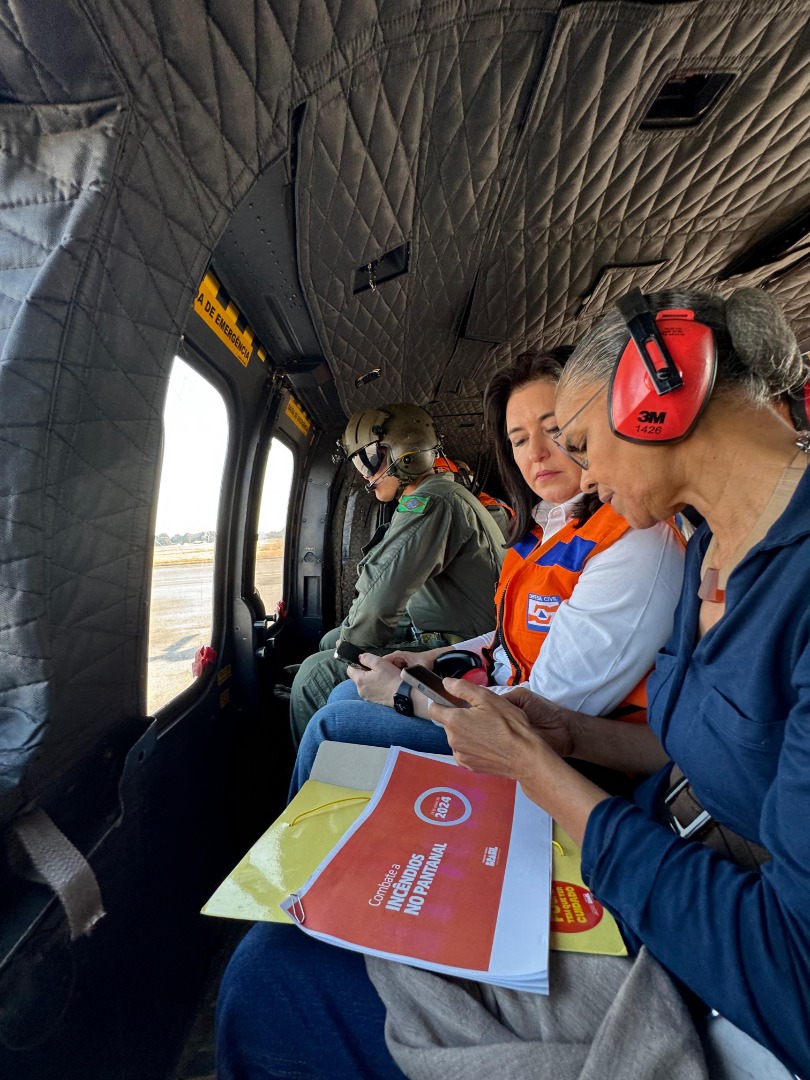 As ministras e o governador sobrevoaram a região de Corumbá, onde puderam constatar os estragos provocados pelos incêndios, e fizeram duas reuniões, uma na sede da Brigada de Prevenção ao Fogo do Pantanal e outra no Corpo de Bombeiros, acompanhados do Secretário Nacional da Defesa Civil, Wolnei Wolff, da Secretária Nacional do Fundo de Segurança Pública, Camila Pintarelli, representando o Ministério da Justiça e Segurança Pública, vice-chefe de Operações Conjuntas do Ministério da Defesa, general de Divisão Marcelo Arantes, e de parlamentares do Estado. Ministras Simone Tebet e Marina Silva sobrevoam área atingida por incêndios no Pantanal. Foto: Digital/PR